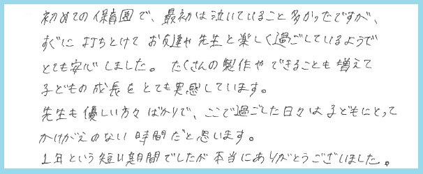 先生も優しい方々ばかりで、ここで過ごした日々は子どもにとってかけがえのない時間だと思います。