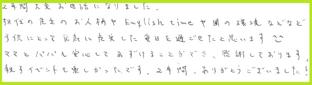 担任の先生のお人柄やEnglish timeや園の環境などなど、子どもにとって元気に充実した毎日を過ごせたと思います。