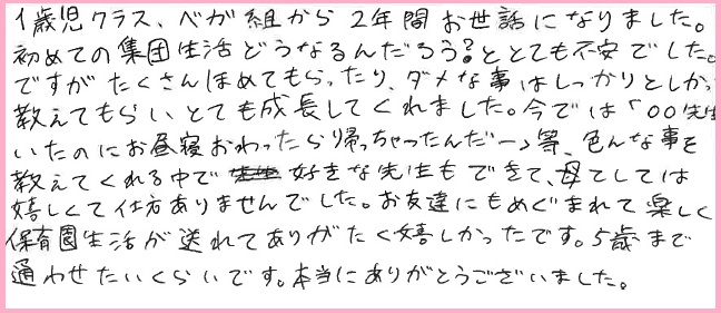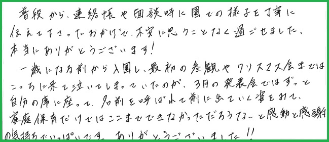 1歳になる前から入園し、最初の参観やクリスマス会まではこっちに来て泣いてしまっていたのが、3月の発表会ではずっと自分の席に座って、名前を呼ばれて前に出ていく姿をみて、家庭保育だけではここまでできなかっただろうな…と感動と感謝の気持ちでいっぱいです。