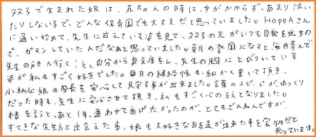 HOPPAさんに通い始めて、先生に甘えている姿を見て、双子の兄がいつも自我を出すのを我慢をしていたんだなあと思いました。