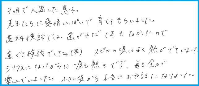 毎日の連絡帳も、細かく書いていただき、小柄な娘の成長を安心して見守る事が出来ました。言葉のスピードがゆっくりだった時も、先生に安心させて頂き、私もすごく心の支えとなりました。