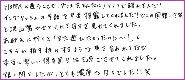 HOPPAに通うことで、「ダンスをそんなにノリノリで踊れるんだ!」「Englishの単語を早速披露してくれるんだ!」「どこの国旗…?笑」と沢山驚かせてくれる毎日を見せてくれました。