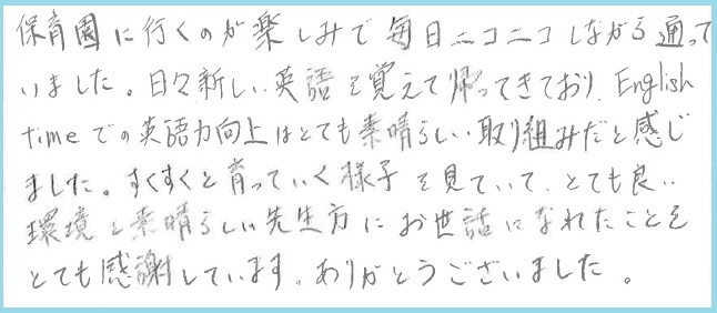 日々新しい英語を覚えて帰ってきており、English timeでの英語力向上はとても素晴らしい取り組みだと感じました。