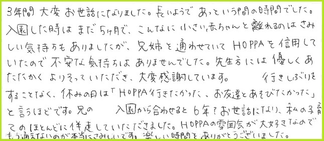 行きしぶりをすることなく、休みの日は「HOPPA行きたかった、お友だちとあそびたかった」と言うほどです。