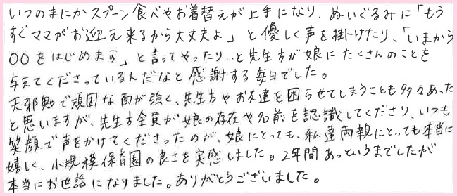 天邪鬼で頑固な面が強く、先生方やお友だちを困らせてしまうことも多々あったと思いますが、先生方全員が娘の存在や名前を認識してくださり、いつも笑顔で声をかけてくださったのが、娘にとっても、私たち両親にとっても本当に嬉しく、小規模保育園の良さを実感しました。