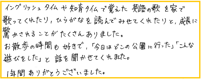 毎日の知育で色んな言葉や色んな事を学べ、日常の着替えやお片づけも丁寧に教えて下さったおかげで、自分でする力が身に付きました。