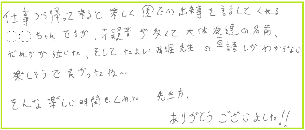 仕事から帰ってくると楽しく園での出来事を話してくれる〇〇ちゃんですが、擬音多くて大体友達の名前、だれかが泣いた、そしてたまに西堀先生の単語しか分からない 楽しそうで良かったね~