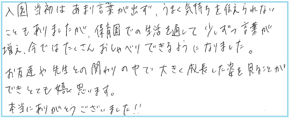 今回のブログでは、卒園児の保護者様からいただいたメッセージをご紹介します😊