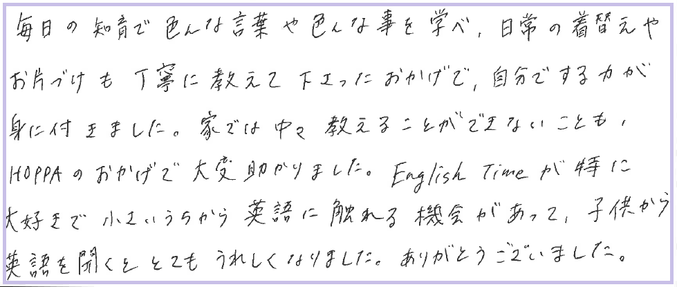 家では中々教えることができないことも、HOPPAのおかげで大変助かりました。