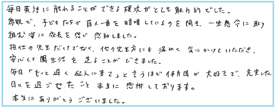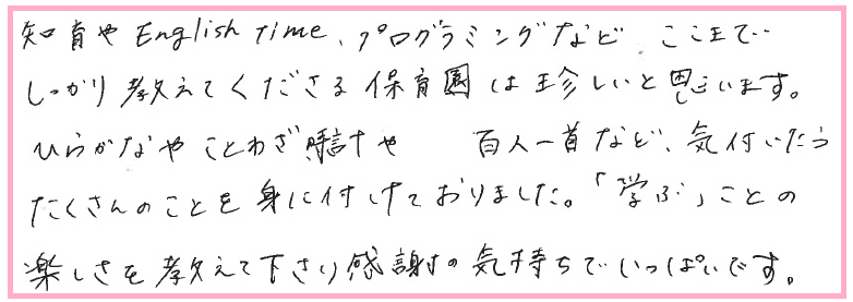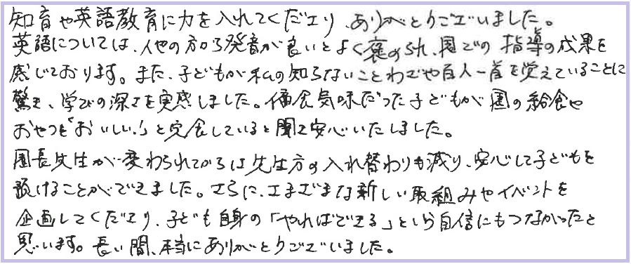 知育や英語教育に力を入れてくださり、ありがとうございました。