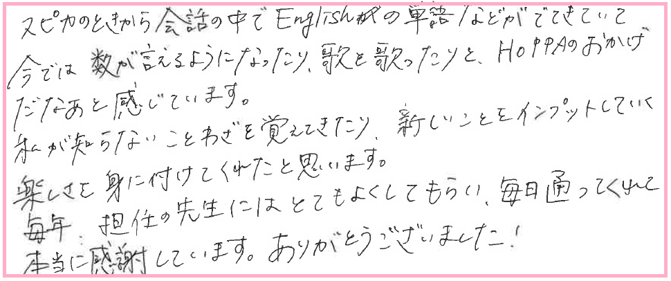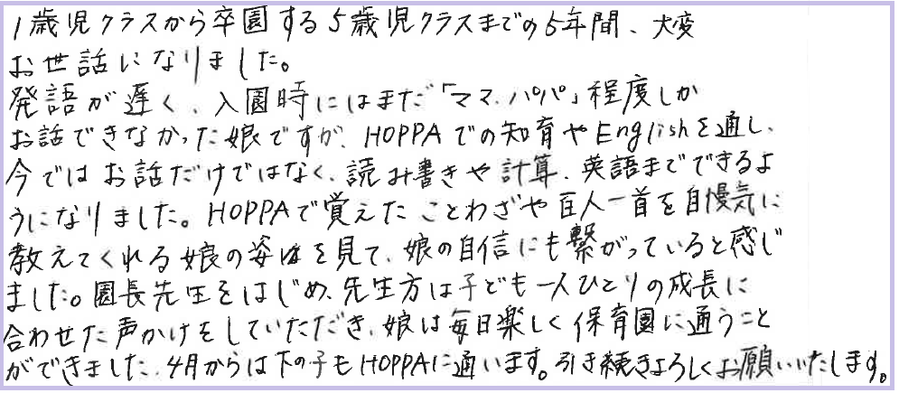 発語が遅く、入園時にはまだ「ママ・パパ」程度しかお話できなかった娘ですが、HOPPAでの知育やEnglishを通し、今ではお話だけでなく、読み書きや計算、英語までできるようになりました。