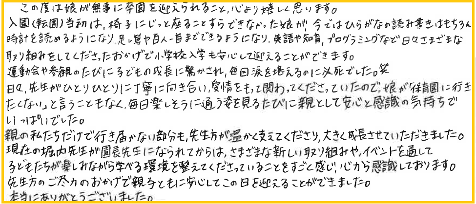 入園(転園)当初は、椅子にじっと座ることもできなかった娘が、今ではひらがなの読み書きはもちろん時計を読めるようになり、足し算や百人一首までできるようになり、英語や知育、プログラミングなど日々さまざまな取り組みをしてくださったおかげで小学校入学も安心して迎えることができます。