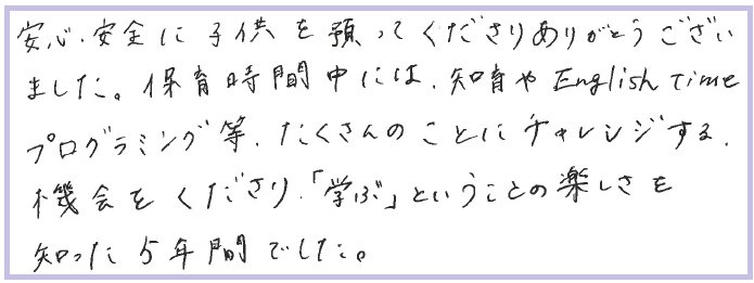 保育時間中には、知育やEnglish time、プログラミング等、たくさんのことにチャレンジする機会をくださり、「学ぶ」ということの楽しさを知った5年間でした。