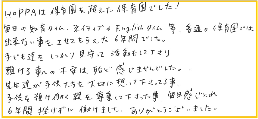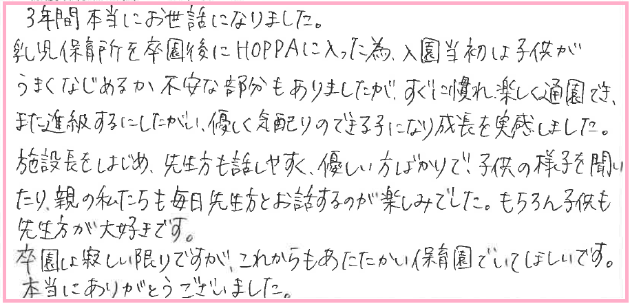 乳児保育所を卒園後にHOPPAに入った為、入園当初は子供がうまく馴染めるか不安な部分もありましたが、すぐに慣れ、楽しく通園でき、また進級するにしたがい、優しく気配りのできる子になり成長を実感しました。