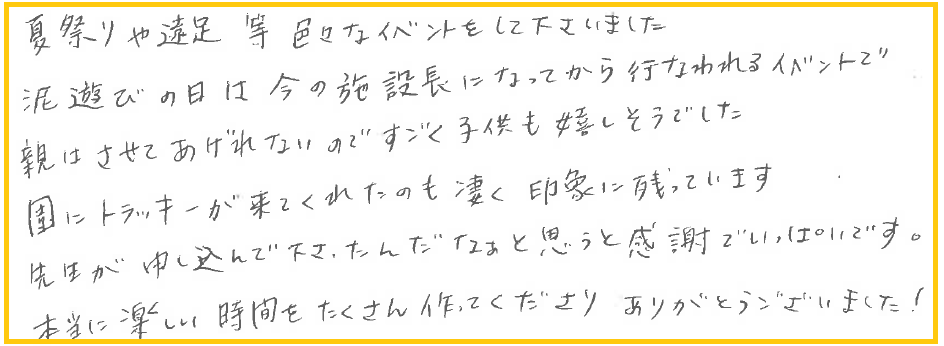 夏祭りや遠足等、色々なイベントをして下さいました。