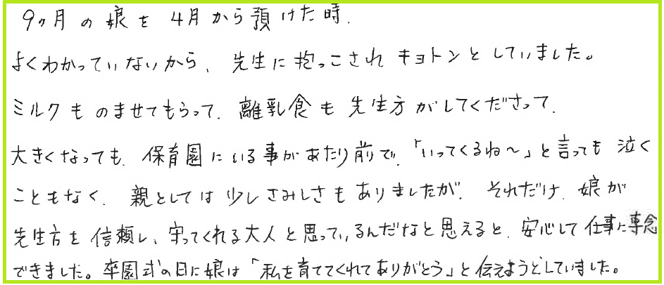 毎日「もっと遅く迎えに来て」と言うほど保育園が大好きで、充実した日々を過ごせたこと、本当に感謝しております。