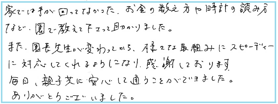 家では手が回っていなかった、お金の数え方や時計の読み方など、園で教えて下さって助かりました。