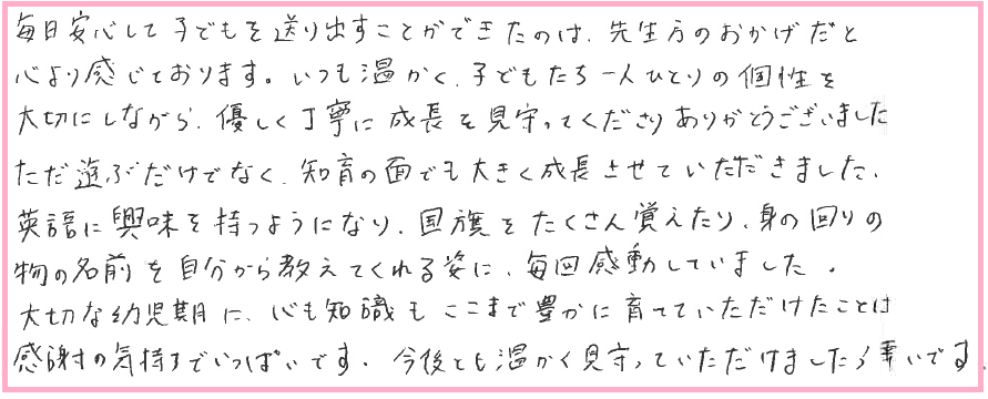 大切な幼児期に、心も知識もここまで豊かに育てていただけたことは感謝の気持ちでいっぱいです。