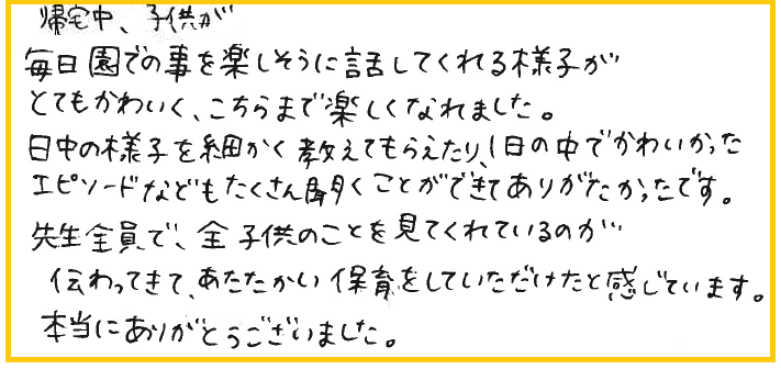 帰宅中、子供が毎日園での事を楽しく話してくれる様子がとてもかわいく、こちらまで楽しくなれました。
