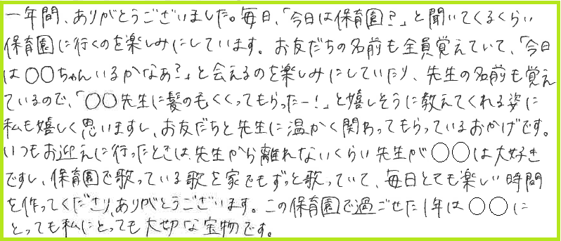 この保育園で過ごせた1年は〇〇にとって私にとっても大切な宝物です。