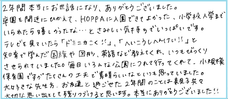 卒園を間近にひかえて、HOPPAに入園できてよかった、小学校入学までいられたら嬉しかったな…とさみしい気持ちでいっぱいです。