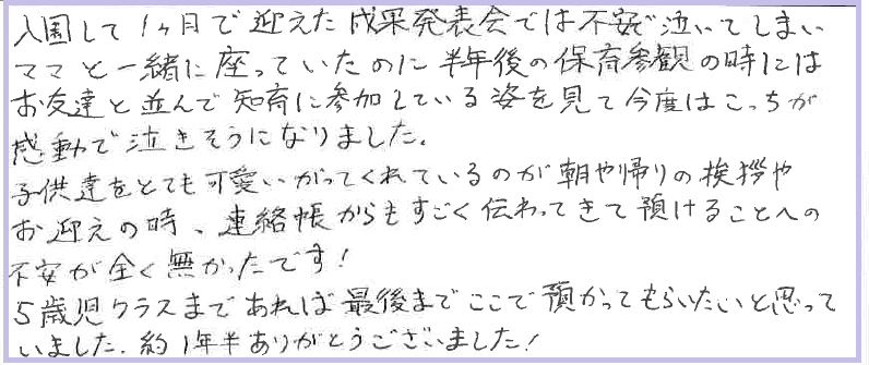 大好きな先生方、お友達と過ごせた2年間のことは親子共々大切な思い出として残りつづけると思います。