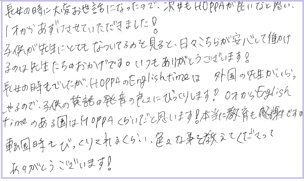 長女の時に大変お世話になったので、次女もHOPPAが良いなと思い、1才からあずけさせていただきました!