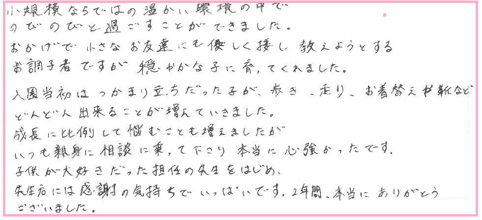 小規模ならではの温かい環境の中で、のびのびと過ごすことができました。