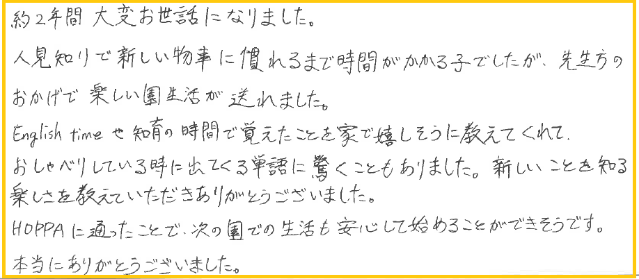 HOPPAに通ったことで、次の園での生活も安心して始めることができそうです。