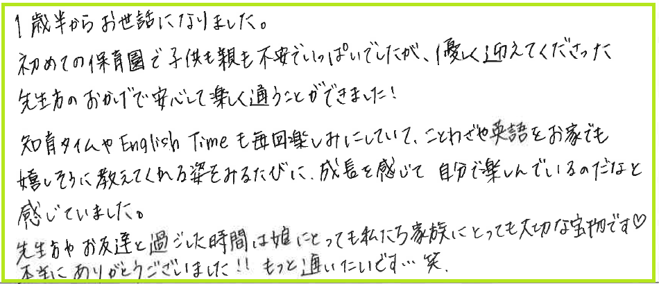 今回のブログでは、卒園児の保護者様からいただいたメッセージをご紹介します😊