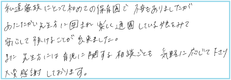また、先生方には育児に関する相談ごとも気軽に応じて下さり、大変感謝しております。