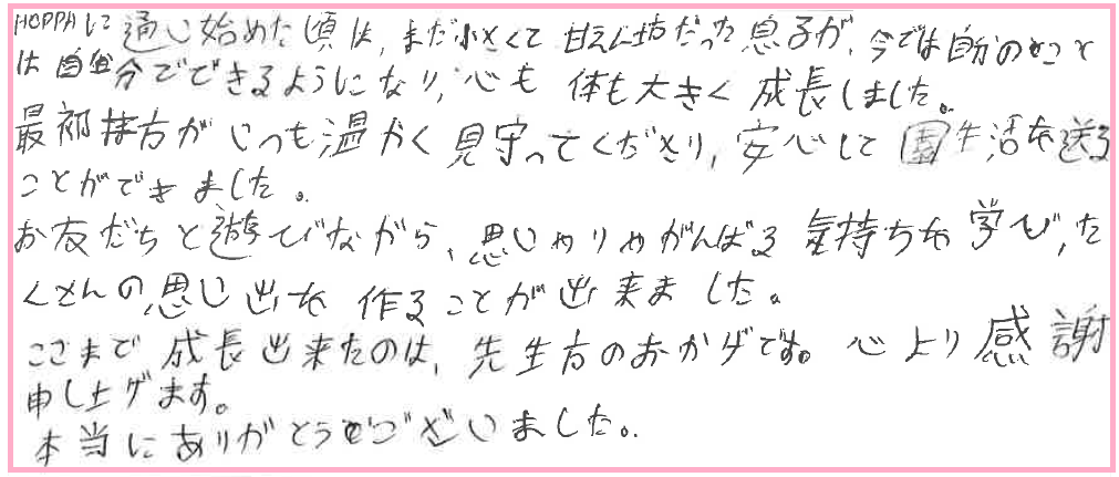 HOPPAに通い始めた頃は、まだ小さくて甘えん坊だった息子が、今では自分のことは自分でできるようになり、心も体も大きく成長しました。