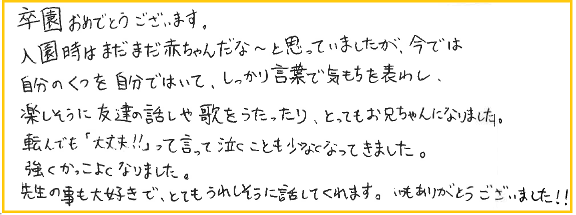 このたび無事に卒園を迎えることができ、先生方には感謝の気持ちでいっぱいです。