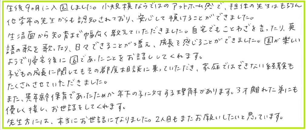 自宅でもことわざを言ったり、英語の歌を歌ったり、日々できることが増え、成長を感じることができました。園が楽しいようで帰宅後に園であったことをお話ししてくれます。