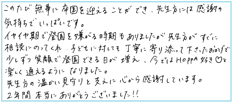 イヤイヤ期で登園を嫌がる時期もありましたが先生方がすぐに相談にのってくれ、子どもに対しても丁寧に寄り添って下さったおかげで少しずつ笑顔で登園できる日が増え、今ではHOPPA大好き♡と楽しく通えるようになりました。