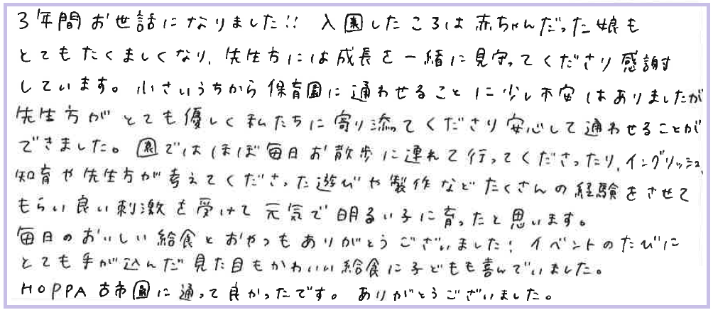 いつも温かく見守ってくださり、安心して園生活を送ることができました。