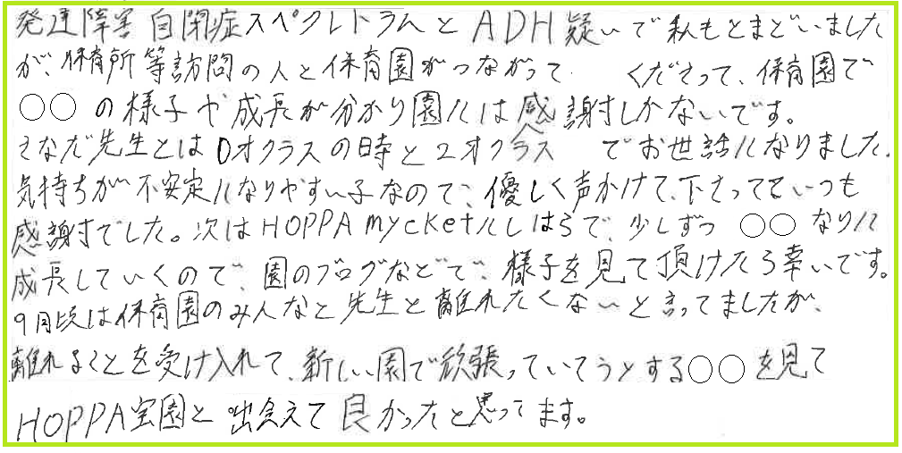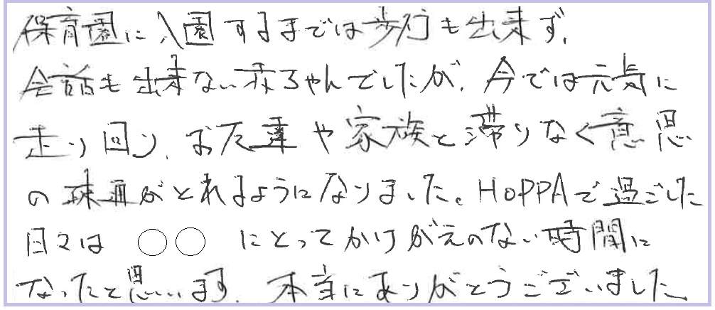 9月頃は保育園のみんなと先生と離れたくないと言ってましたが、離れることを受け入れて、新しい園で頑張っていこうとする○○を見てHOPPA宝園と出会えて良かったと思っています。