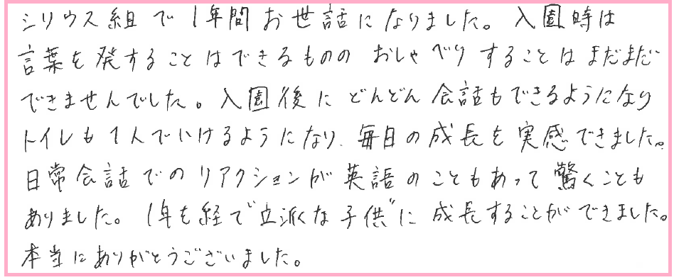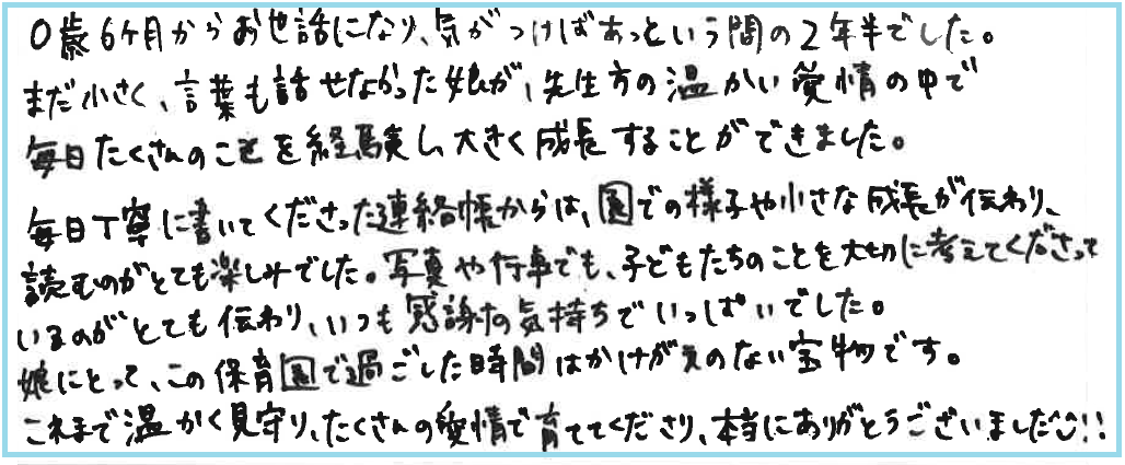 園での様子を伺うたびに先生方の愛情が子供を通して私たち親にも伝わり心温まり嬉しく思っていました。