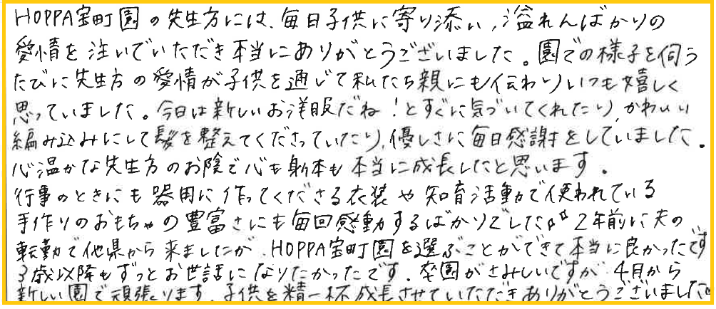 HOPPA宝町園の先生方には、毎日子供に寄り添い、溢れんばかりの愛情を注いでいただき本当にありがとうございました。
