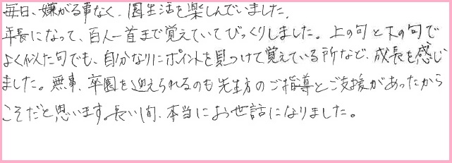 上の句と下の句でよく似た句でも、自分なりにポイントを見つけて覚えている所など成長を感じました。