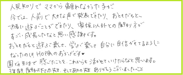転園後もどの先生が好き?って聞くと、HOPPAの先生の名前をずっと言っており、娘にとっても親にとってもかけがえのない場所だったと思っています。