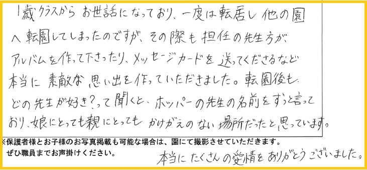 1歳クラスからお世話になっており、一度は転居し他の園に転園してしまったのですが、その際も担任の先生方がアルバムを作ってくださったり、メッセージカードを送ってくださるなど本当に素敵な思い出を作っていただきました。