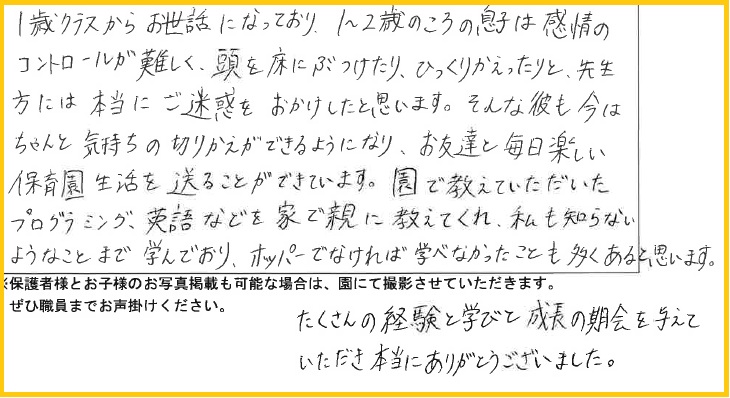 1歳クラスからお世話になっており、1~2歳のころの息子は感情のコントロールが難しく、頭を床にぶつけたり、ひっくりかえったりと先生方には本当にご迷惑をおかけしたと思います。