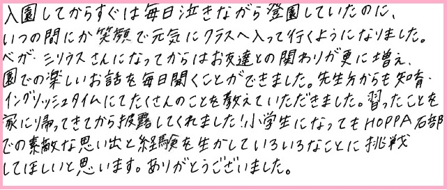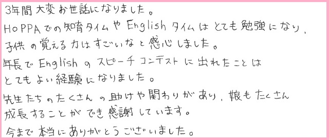 小学生になってもHOPPA石部での素敵な思い出と経験を生かしていろいろなことに挑戦してほしいと思います。