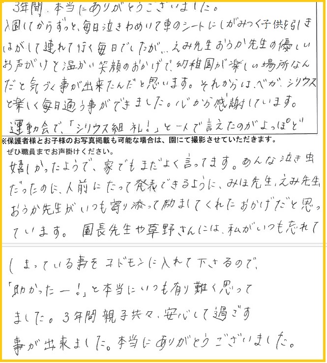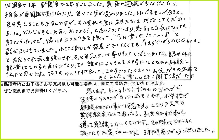 入園してからずっと毎日泣きわめいて車のシートにしがみつく子供を引きはがして連れていく毎日でしたが、えみ先生おうか先生の優しいお声がけと温かい笑顔のおかげで幼稚園が毎日楽しい場所なんだと気づく事ができたんだと思います。
