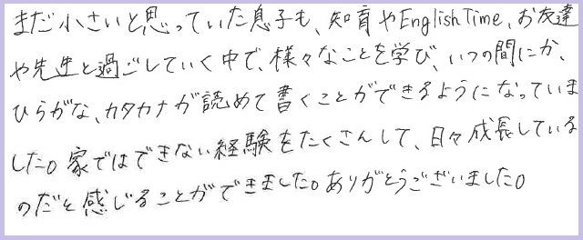 まだ小さいと思っていた息子も、知育timeやEnglish time、お友達や先生と過ごしていく中で、様々なことを学び、いつの間にか、ひらがな、カタカナが読めて書くことができるようになっていました。