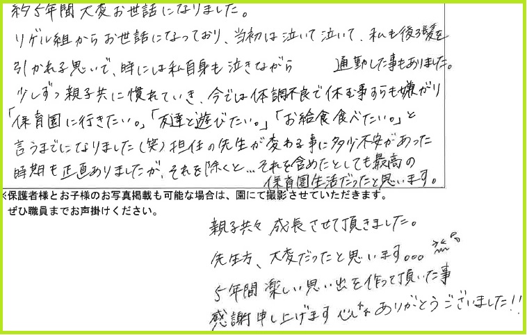 担任の先生が変わる事に多少不安があった時期もありましたが、それを除くと…それを含めたとしても最高の保育園生活だったと思います。