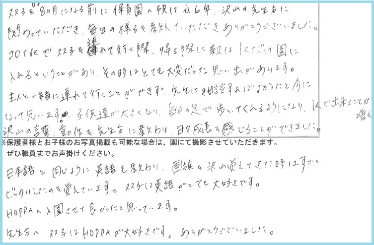 HOPPAに入園させて良かったと思っています。