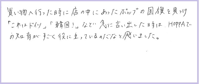 買い物に行った時に店の中にあったポップの国旗を見つけ、「これはドイツ」「韓国!」など急に言い出した時はHOPPAでの知育がすごく役に立っているのだなと感じました。
