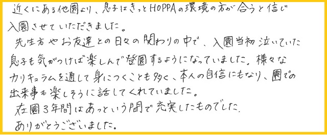 近くにある他園より、息子はきっとHOPPAの環境の方が合うと信じ入園させていただきました。
